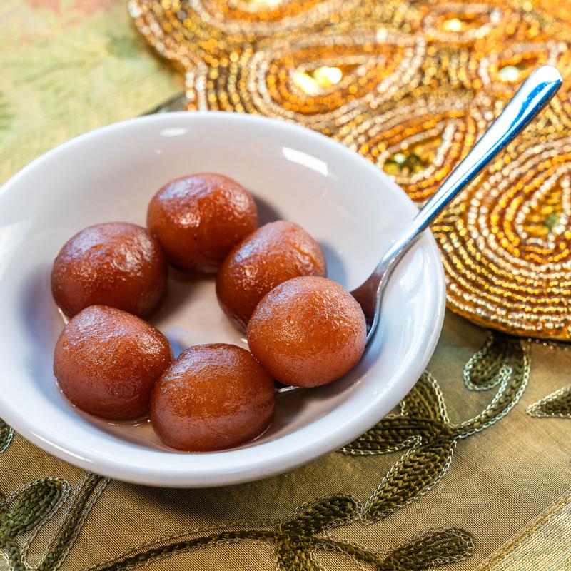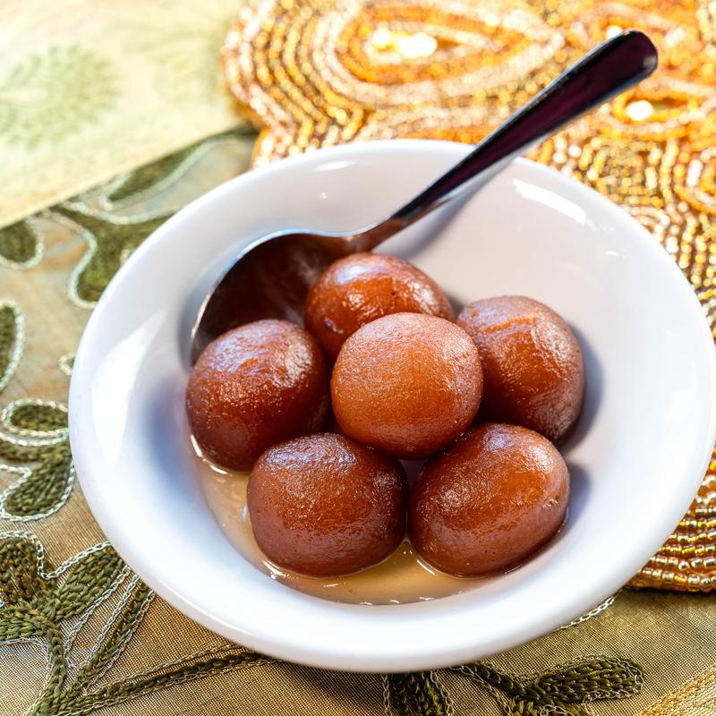 Gulab jamun is made with powder fried into berry-sized balls and dunked in a sugar syrup.