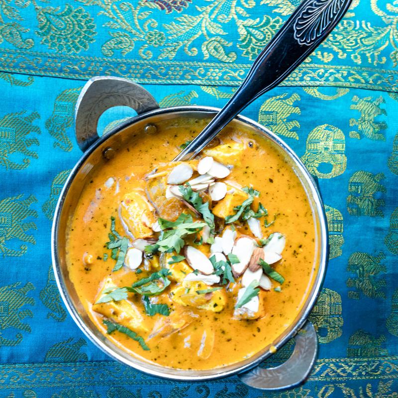 Chicken cooked in a creamy sauce with almonds and dried nuts, and lightly spiced.