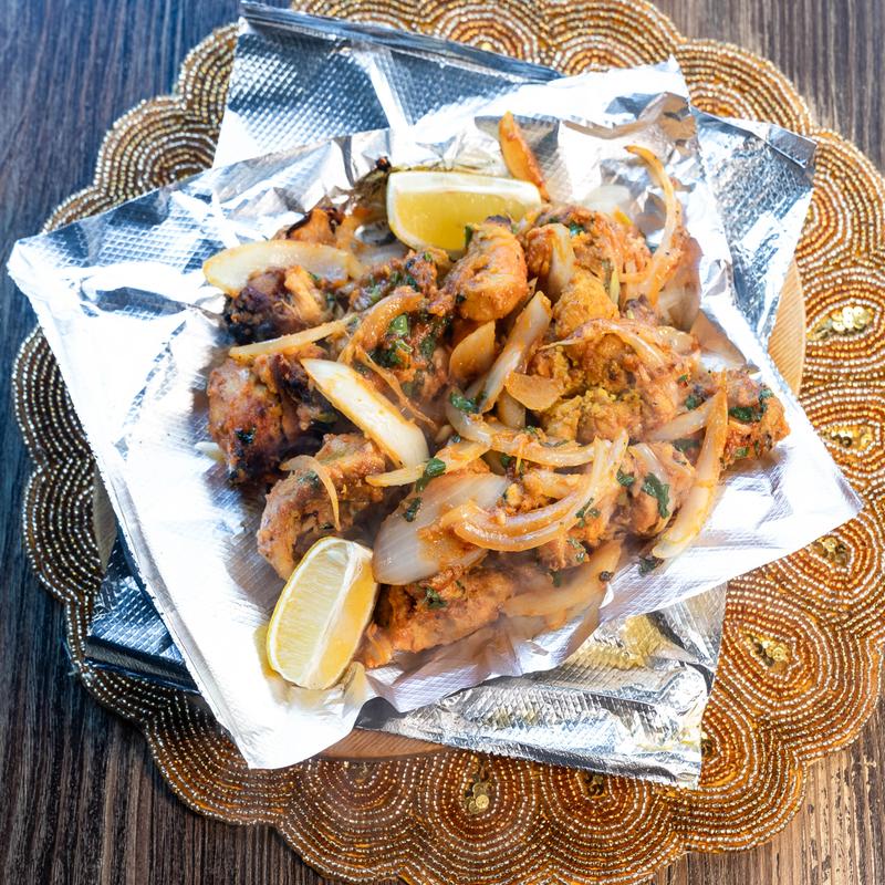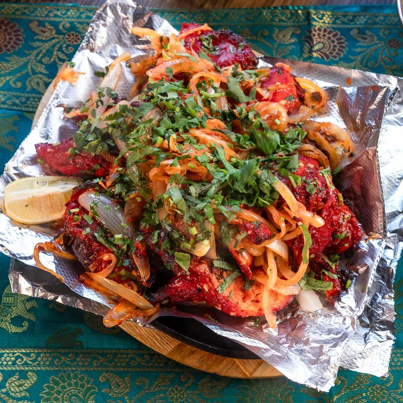 Marinated chicken with yogurt, cut into slices, is roasted on an Indian tawa with onion and spices and served sizzling.