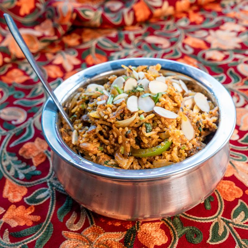 Biryani is a one-dish rice-based meal that consists of layering cooked rice with raisins and chicken pieces in a casserole served with raita.