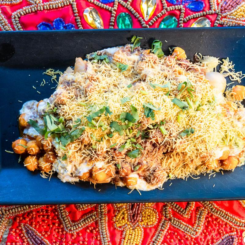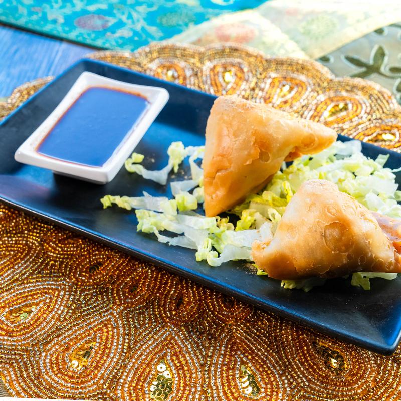 Samosa served with spicy chickpea gravy, topped with onions, cilantro, and green and sweet chutney.